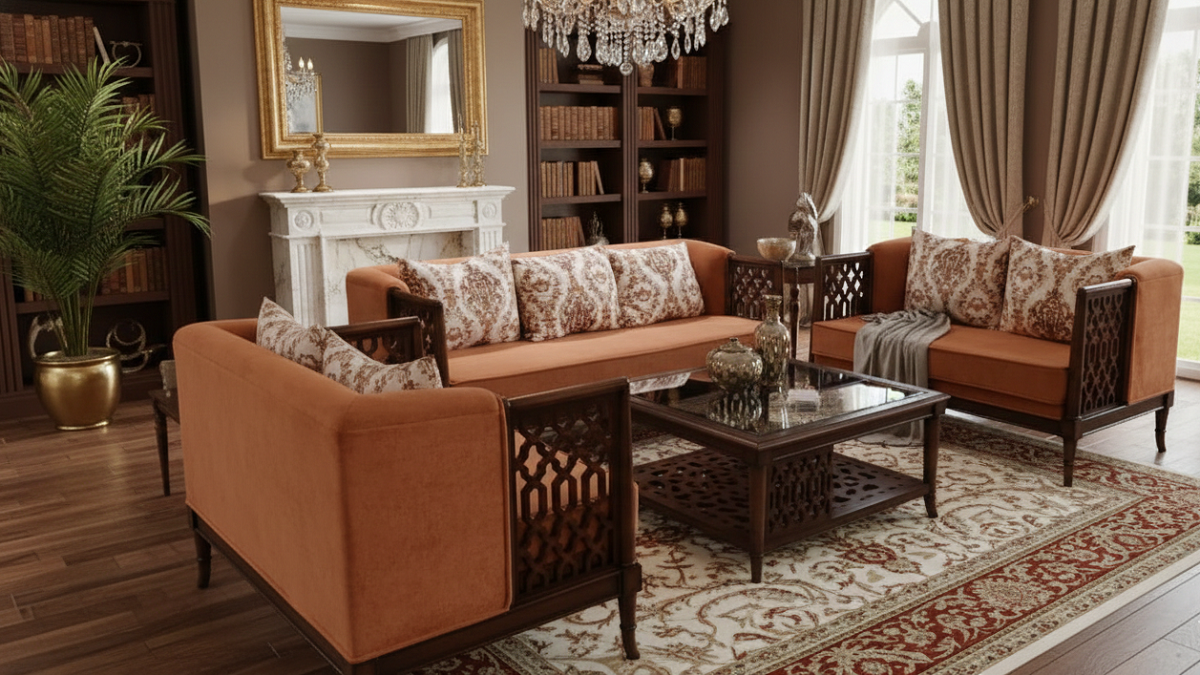Visual Lightness: Unlike bulky, fully upholstered sofas, the “see-through” nature of Jali work makes a room feel larger and more open.